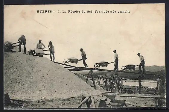 AK Hyères, La Récolte du Sel l`arrivée à la camelle, Salzbergwerk