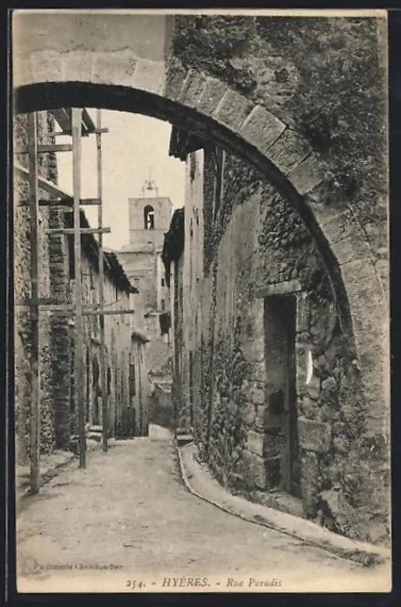 AK Hyères, Rue Paradis avec arc en pierre et bâtiments anciens