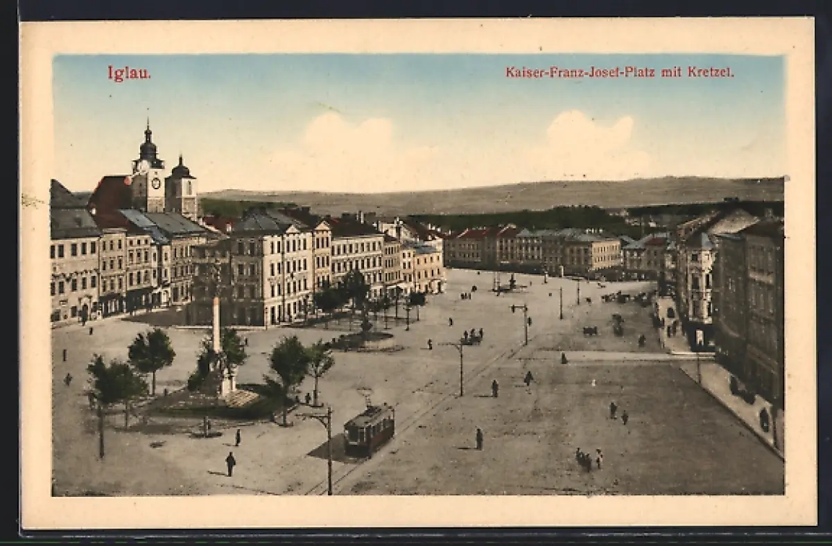 AK Iglau, Kaiser Franz Josef Platz mit Kretzel und Strassenbahn