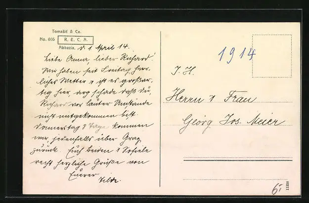 Personenbezogene Daten auf der Rückseite der Karte wurden durch blauen Textmarker unkenntlich gemacht. Die blauen Stellen sind auf die Vorderseite durchgeweicht und wirken sich negativ auf das Postkartenfoto aus