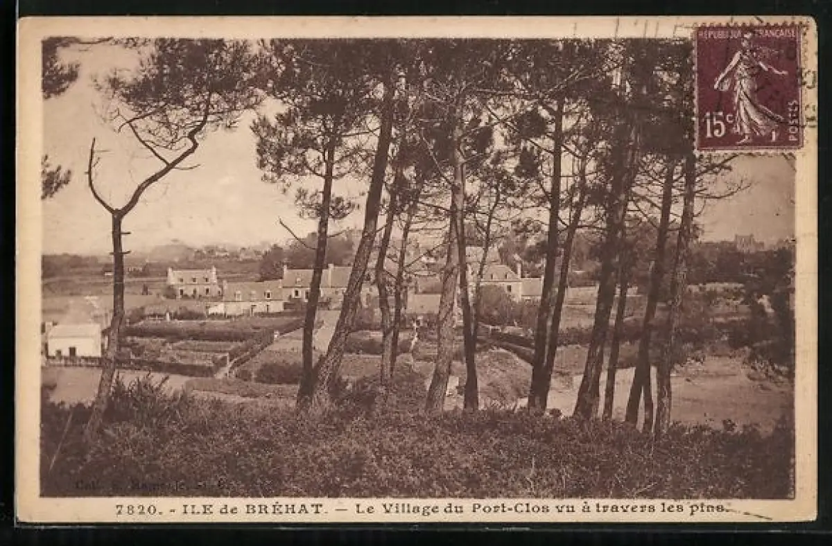 AK Île de Bréhat, Le Village du Port-Clos vu à travers les pins
