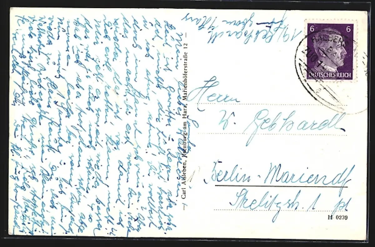 Personenbezogene Daten auf der Rückseite der Karte wurden durch blauen Textmarker unkenntlich gemacht. Die blauen Stellen sind auf die Vorderseite durchgeweicht und wirken sich negativ auf das Postkartenfoto aus