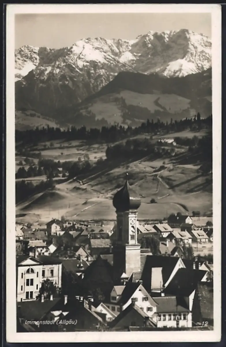 AK Immenstadt, Ortsmitte mit Kirche und Alpenpanorama