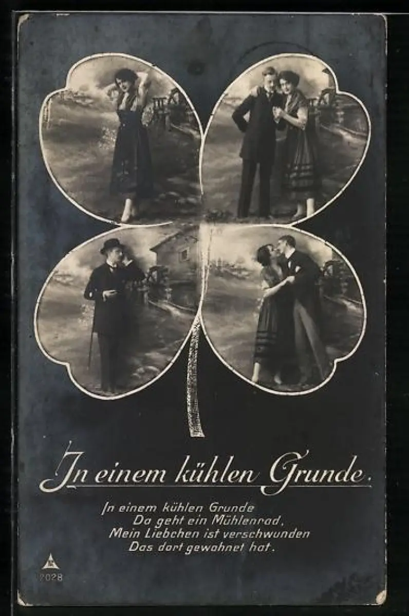 AK In einem kühlen Grunde, Ansichten vom Liebespaar auf einem Kleeblatt