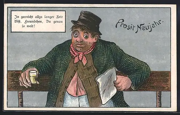 AK In garnicht allzu langer Zeit..., Betrunkener mit Schnapsglas, Neujahrsgruss, Trinkerhumor