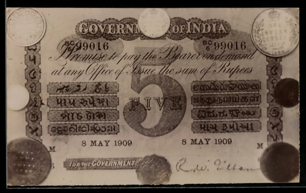 AK Indischer Geldschein 5 Rupees, Münzen