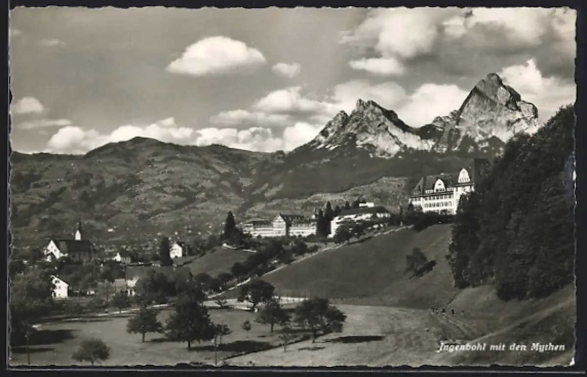 AK Ingenbohl, Ortsansicht mit Kirche und den Mythen