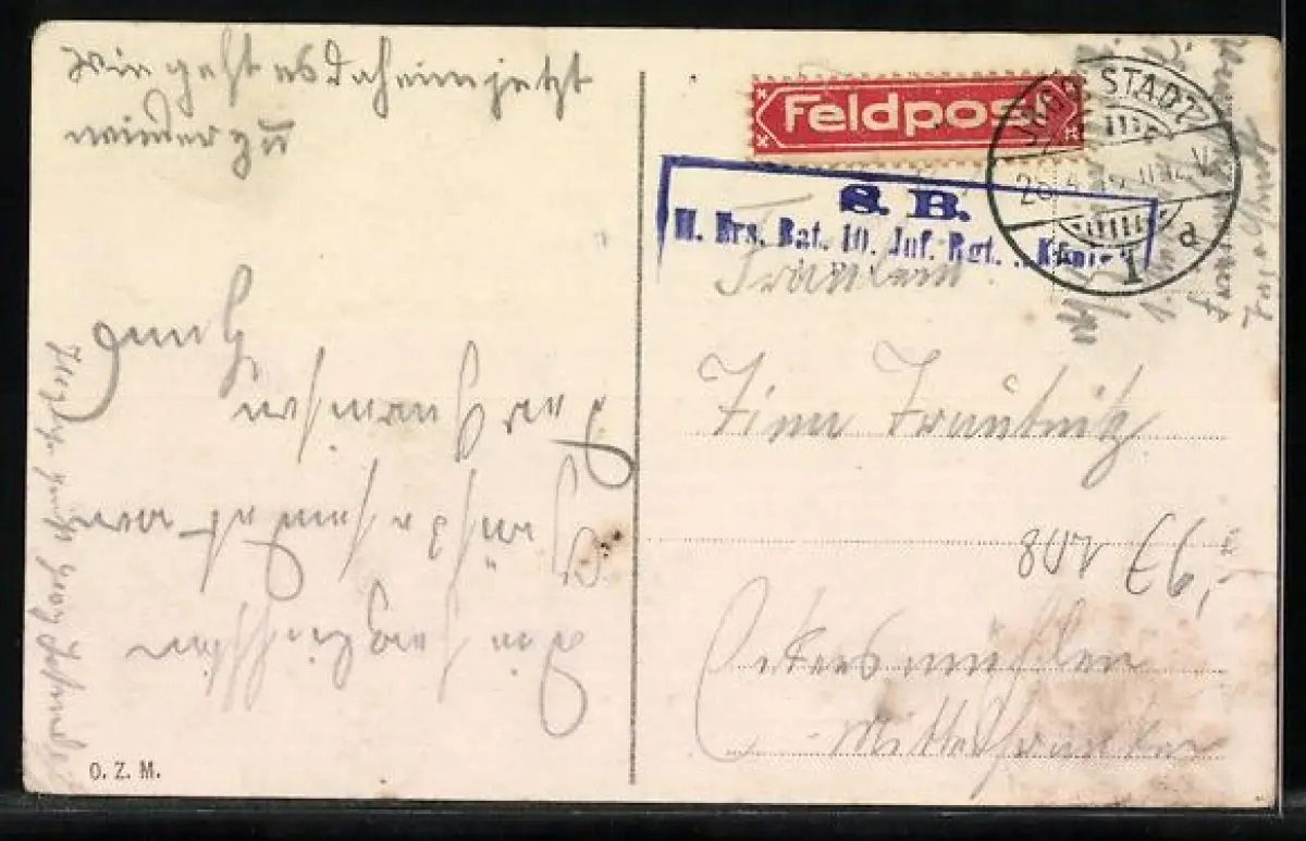 Personenbezogene Daten auf der Rückseite der Karte wurden durch blauen Textmarker unkenntlich gemacht. Die blauen Stellen sind auf die Vorderseite durchgeweicht und wirken sich negativ auf das Postkartenfoto aus