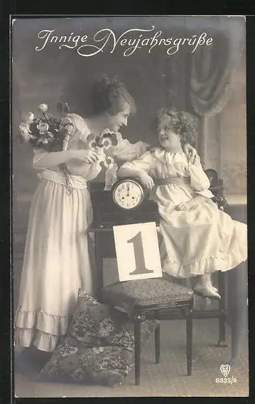 AK Innige Neujahrsgrüsse mit Mutter und Tochter