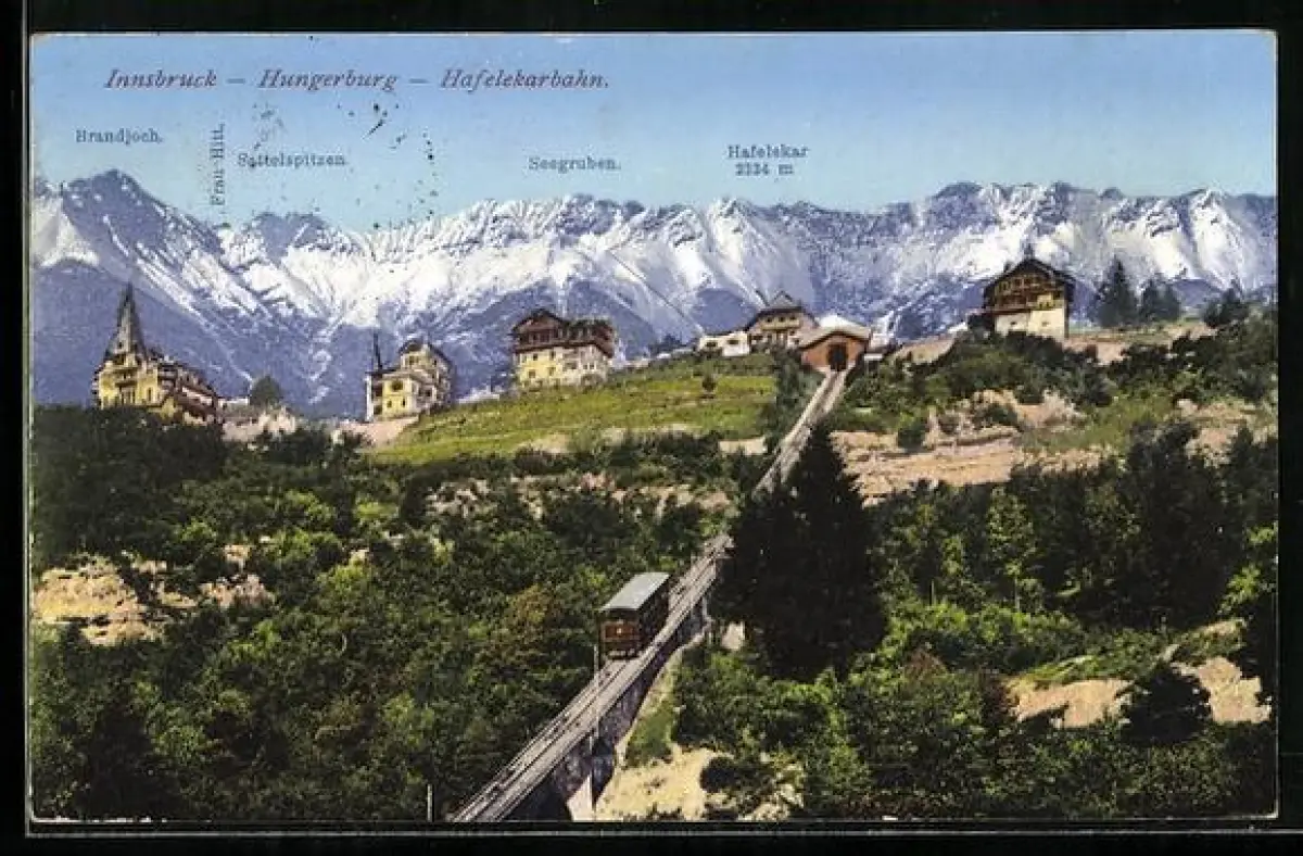 AK Innsbruck, Hungerburg - Hafelekarbahn mit Bergpanorama, Bergbahn