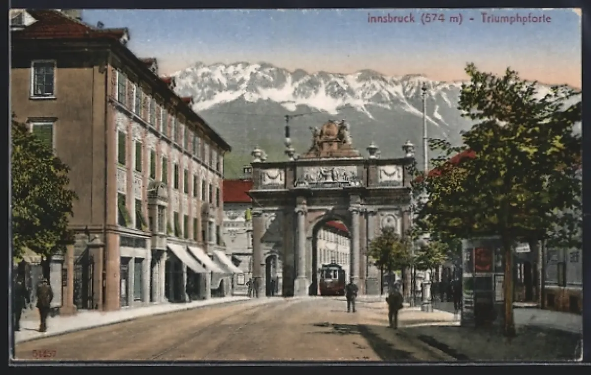 AK Innsbruck, Triumpfpforte mit durchfahrender Strassenbahn