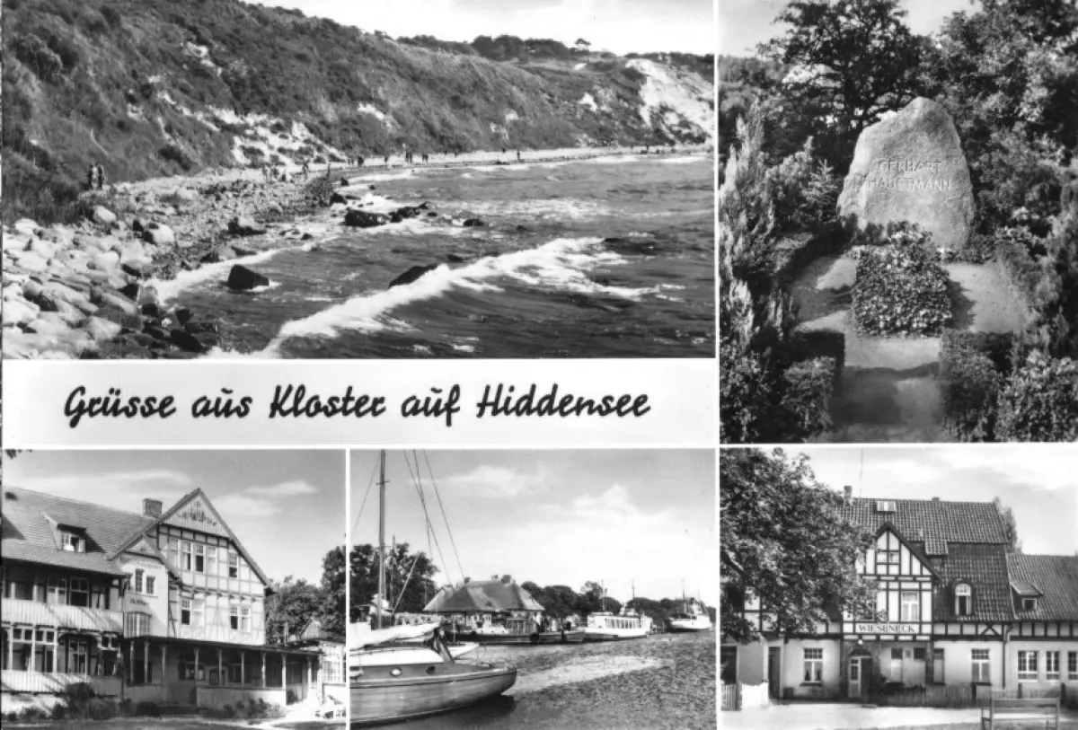 Ansichtskarte Insel Hiddensee, Kloster fünf Abb. - Grabstätte v. Gerhard Hauptmann, FDGB-Erholungsheim "Hitthim", Hafen, FDGB-Vertragsheim "Wieseneck" Erhaltung I-II ungelaufen Druckvermerk: 1973 Herstellungsland: DDR Verlag: Planet-Verlag Berlin - 03 01 12 043M