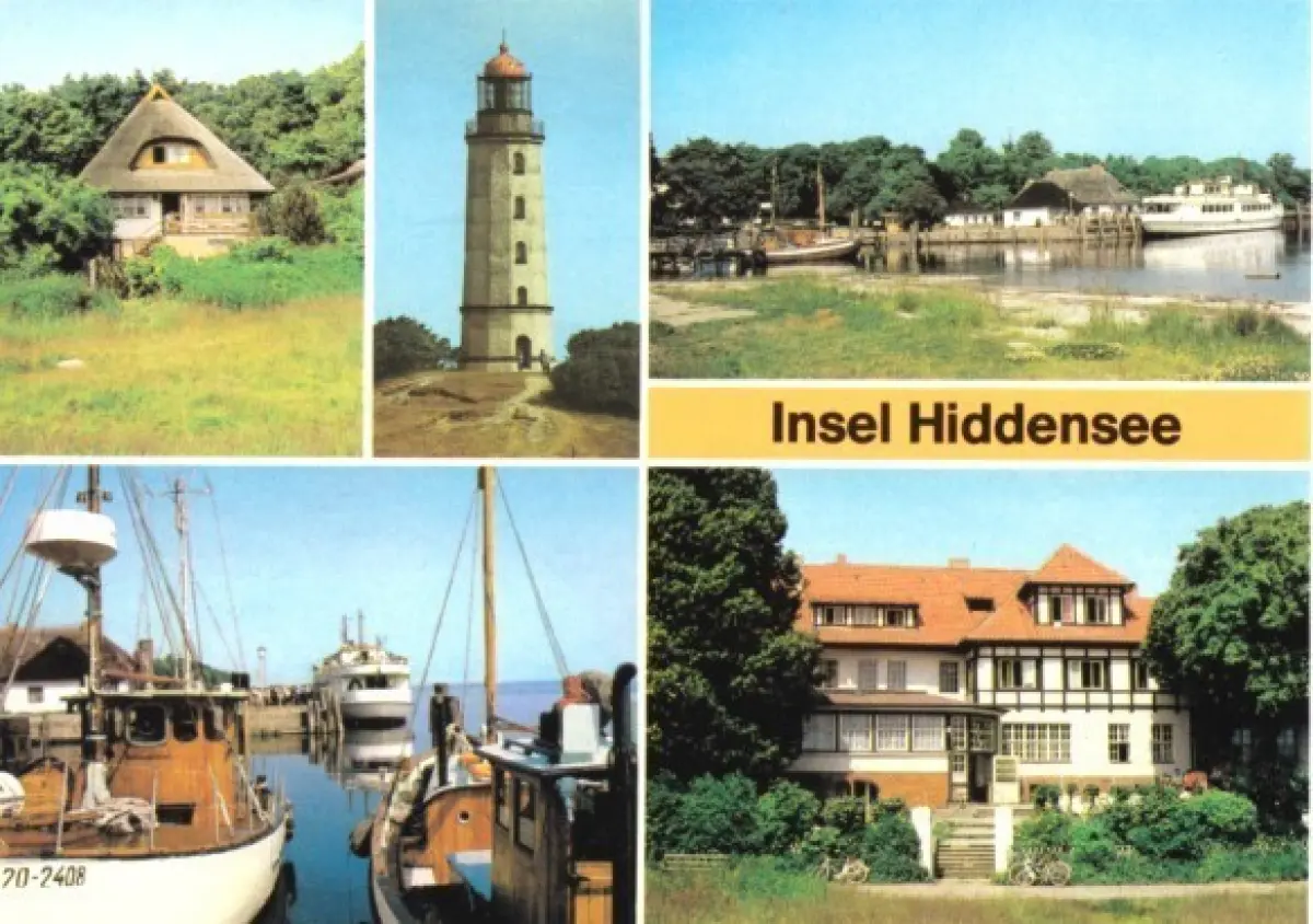 Ansichtskarte Insel Hiddensee Kloster fünf Abb. - Fischerhaus, Leuchtturm, Alegestelle, Hafen, HOG "Dornbusch" Erhaltung I-II ungelaufen Druckvermerk: 1987 Herstellungsland: DDR Verlag: VEB Bild und Heimat, Reichenbach i. V. - 01 01 0412/12