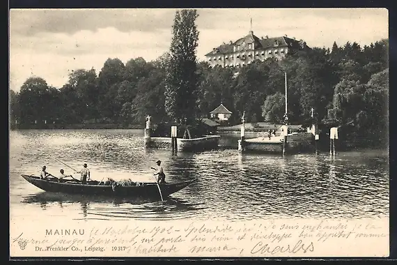 AK Insel Mainau, Panorama mit Schloss Mainau und Boot