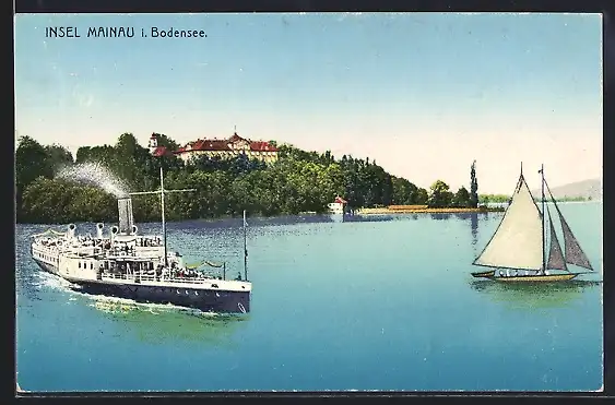 AK Insel Mainau i. Bodensee, Dampfer und Segelschiff auf dem See