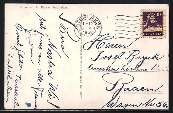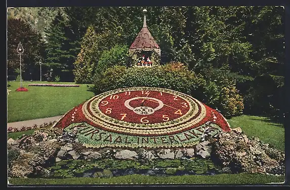 AK Interlaken, Blumenuhr im Kursaal, mit Turm