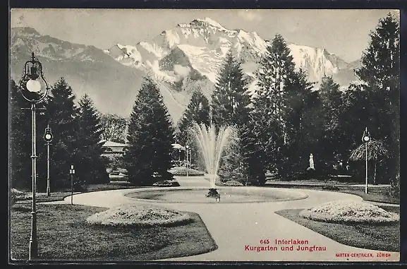 AK Interlaken, Kurgarten, Partie mit Springbrunnen u. Jungfrau