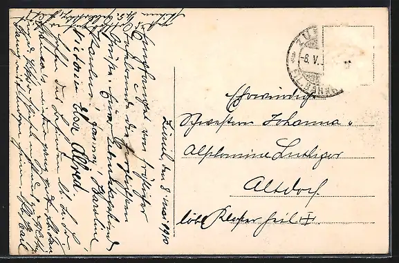 gelaufen 1910, Briefmarke entfernt, rückseitig Oberflächenschaden, guter Zustand