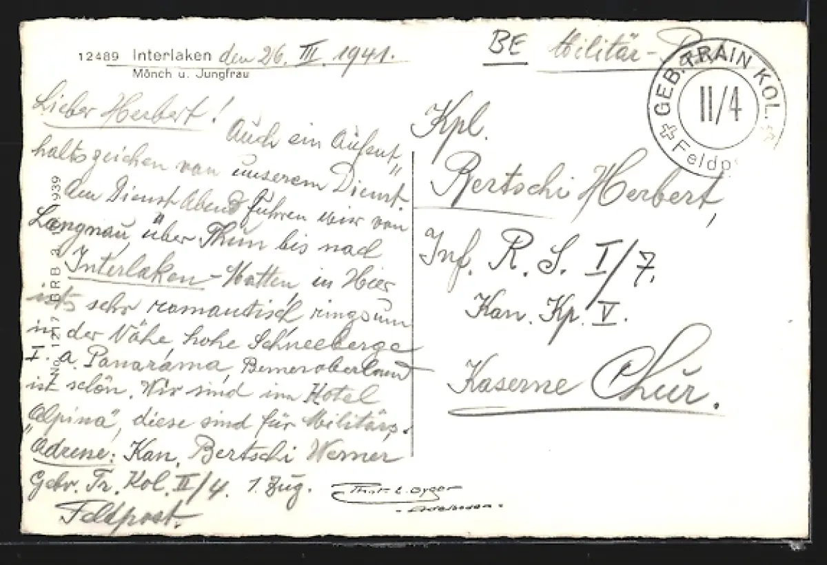 AK Interlaken, Ortsansicht mit Mönch und Jungfrau