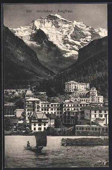 AK Interlaken, Ortspartie mit Jungfrau und Boot