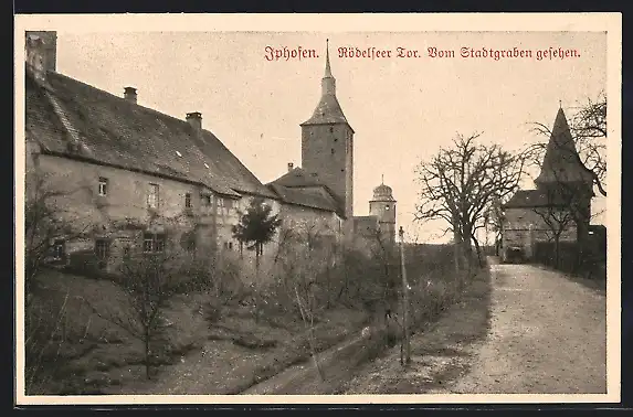 AK Iphofen, Ansicht des Rödelseer Tors vom Stadtgraben gesehen