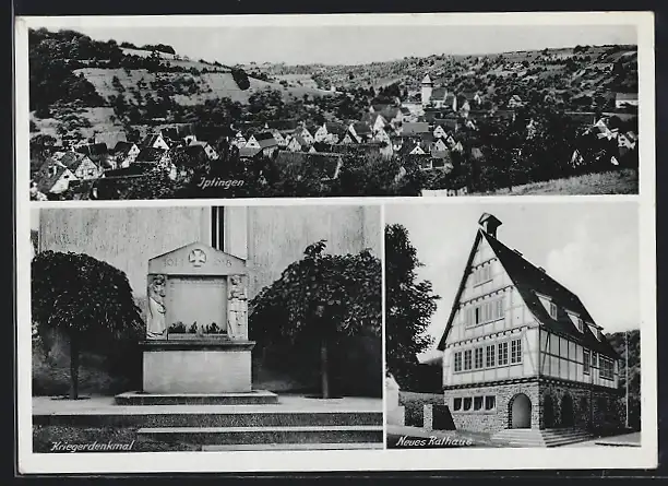 AK Iptingen, Neues Rathaus, Kriegerdenkmal, Ortsansicht