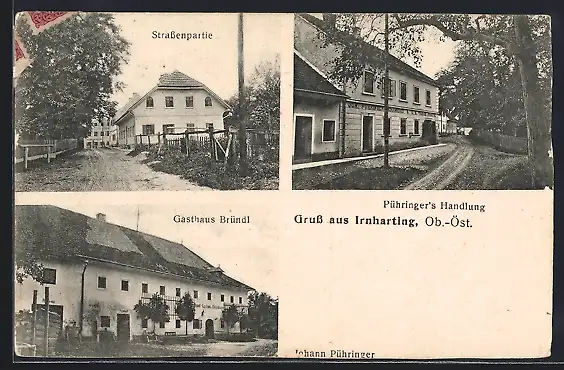 AK Irnharting /Ob.-Öst., Pühringer`s Handlung, Gasthaus Bründl, Strassenpartie
