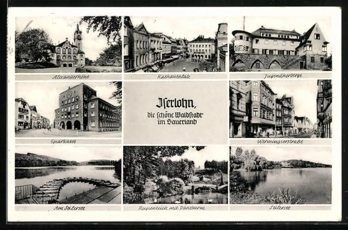 AK Iserlohn, Alexanderhöhe, Rathausplatz, Jugendherberge, Sparkasse, Wermingserstrasse, Seilersee