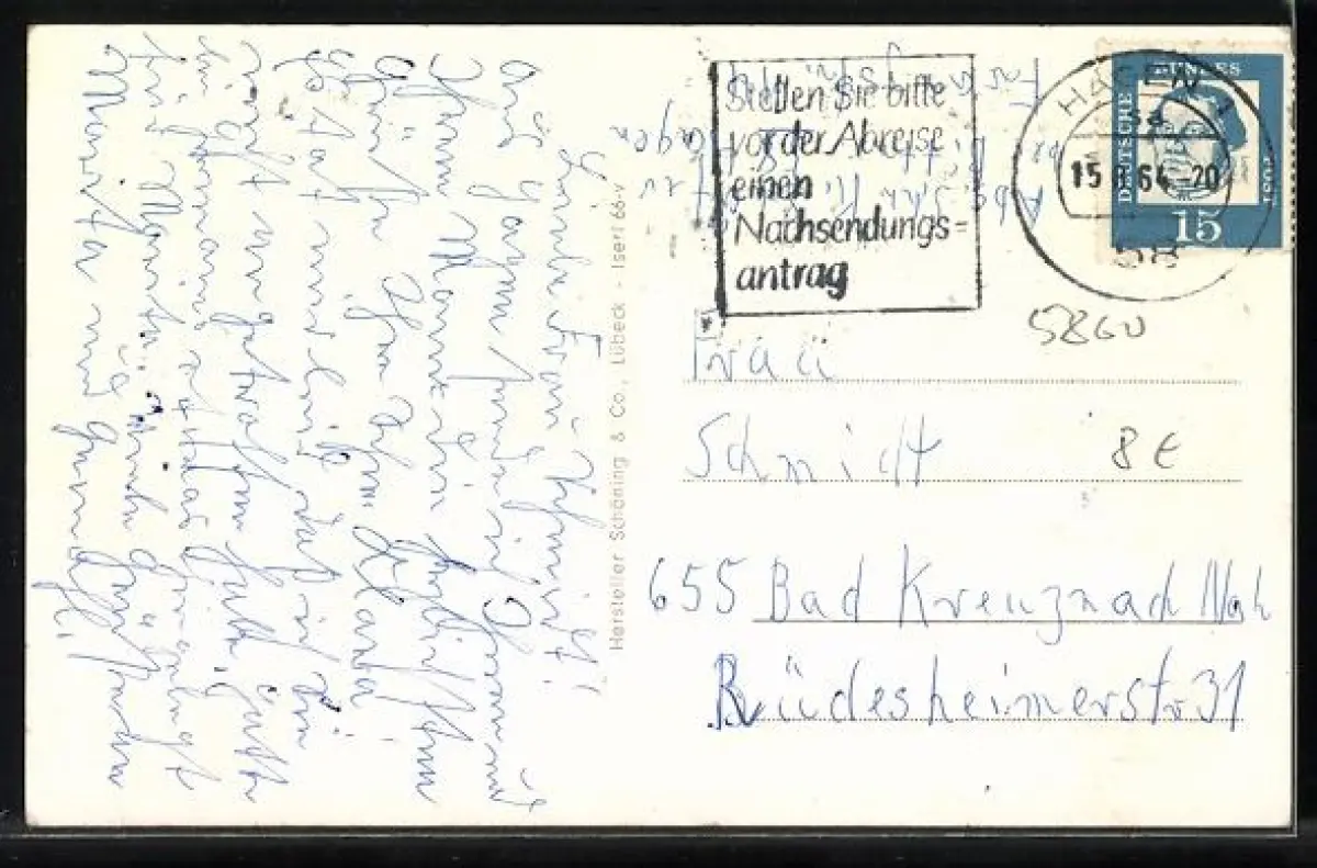 Personenbezogene Daten auf der Rückseite der Karte wurden durch blauen Textmarker unkenntlich gemacht. Die blauen Stellen sind auf die Vorderseite durchgeweicht und wirken sich negativ auf das Postkartenfoto aus