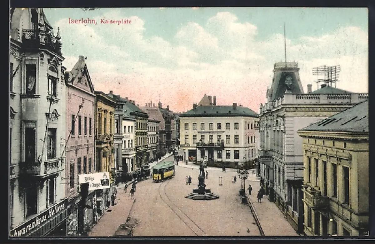 AK Iserlohn, Kaiserplatz aus der Vogelschau, Strassenbahn