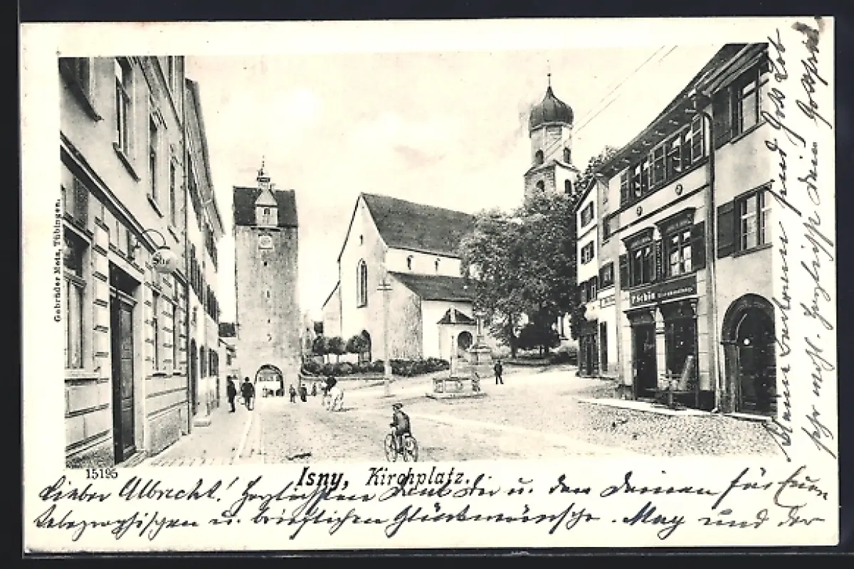 AK Isny, Kirchplatz mit Kirche und Torturm