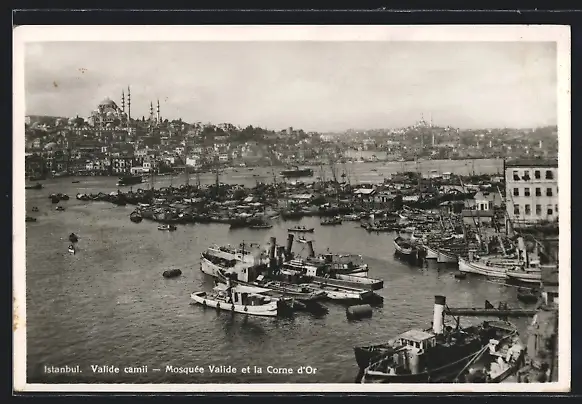 AK Istanbul, Valide camii, Mosquée Valide et la Corne d`Or, Boote liegen im Hafen