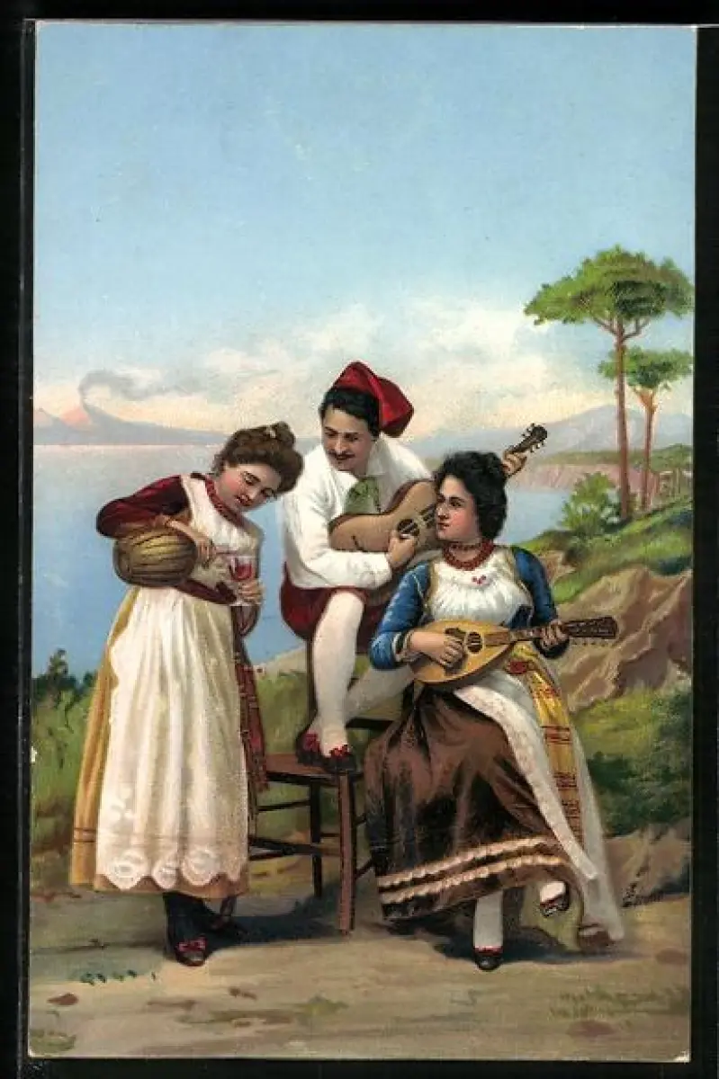AK Italienische Anwohner musizieren bei Wein in Trachtenkleidung