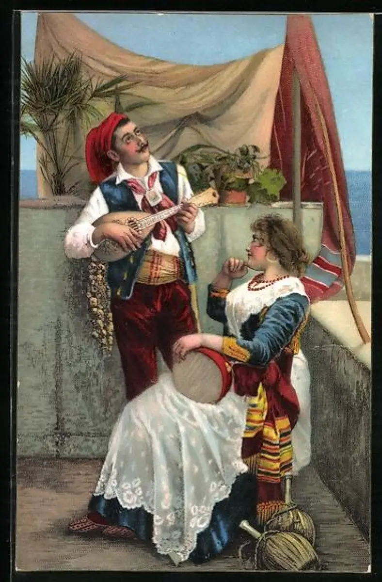 AK Italienischer junger Mann spielt seiner Liebsten auf einem Saiteninstrument etwas vor