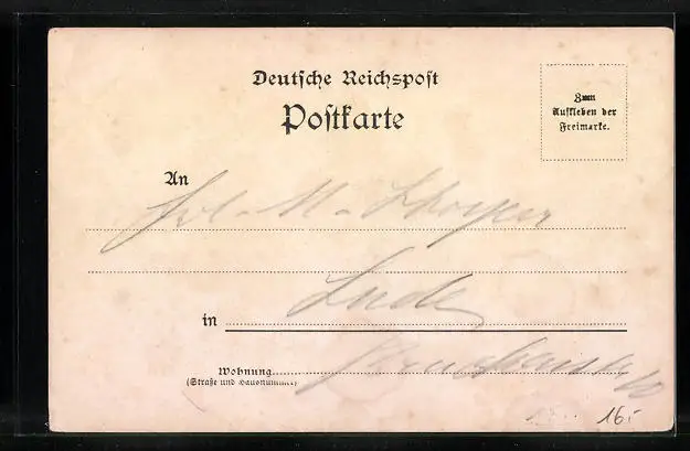 Personenbezogene Daten auf der Rückseite der Karte wurden durch blauen Textmarker unkenntlich gemacht. Die blauen Stellen sind auf die Vorderseite durchgeweicht und wirken sich negativ auf das Postkartenfoto aus