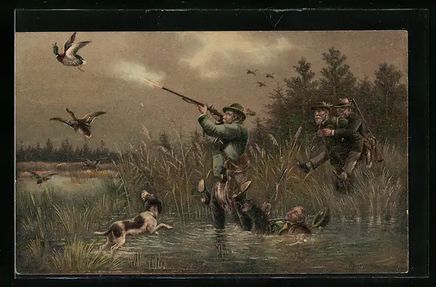 AK Jäger fällt ins Wasser beim Schuss nach Enten, Jagdhumor