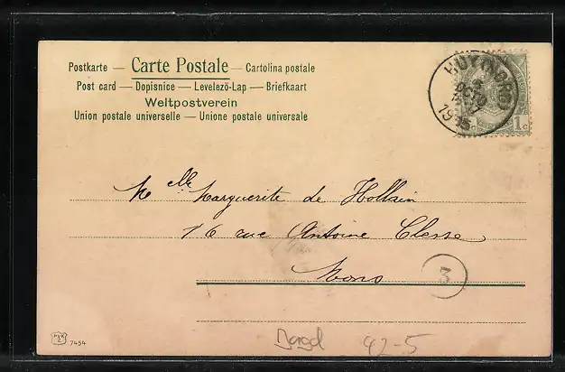 Personenbezogene Daten auf der Rückseite der Karte wurden durch blauen Textmarker unkenntlich gemacht. Die blauen Stellen sind auf die Vorderseite durchgeweicht und wirken sich negativ auf das Postkartenfoto aus