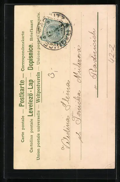Personenbezogene Daten auf der Rückseite der Karte wurden durch blauen Textmarker unkenntlich gemacht. Die blauen Stellen sind auf die Vorderseite durchgeweicht und wirken sich negativ auf das Postkartenfoto aus