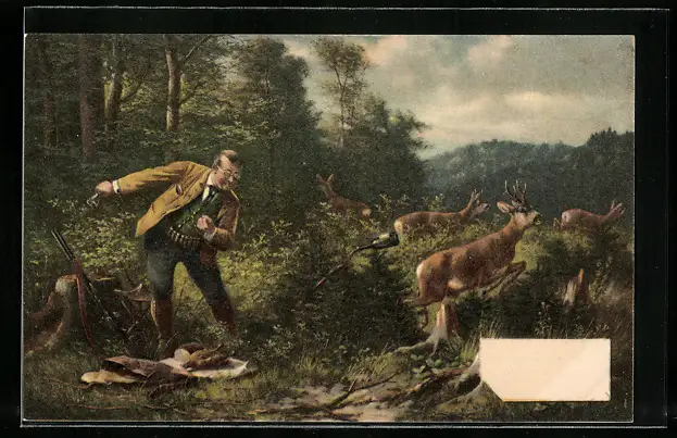 AK Jäger wird beim Picknick von Rehen überrannt, Jagdhumor