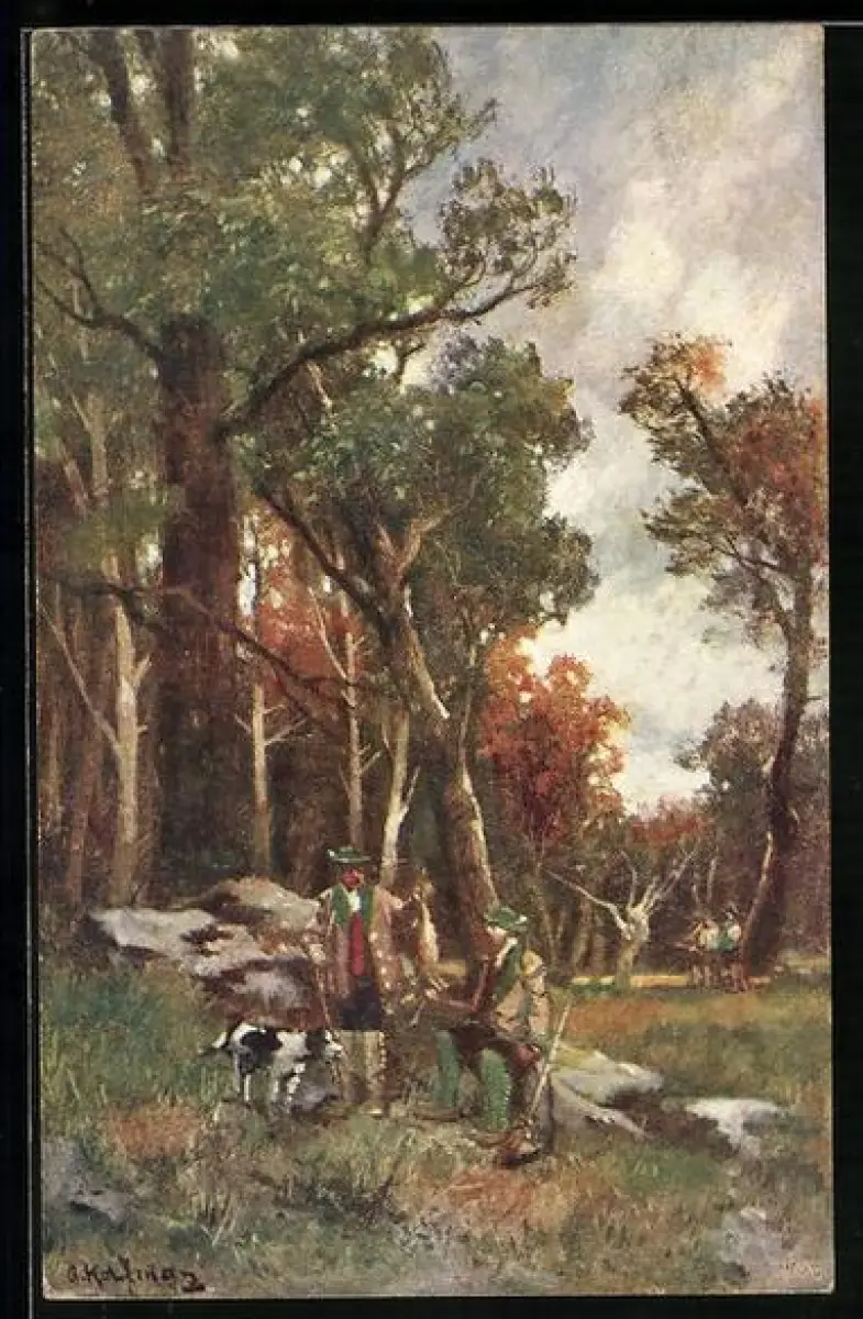 AK Jagd, Zwei Jäger mit Hund im Wald