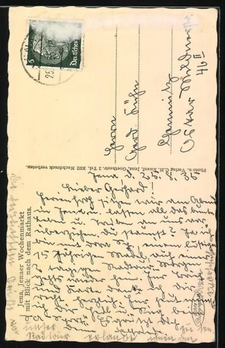gelaufen 1935, rückseitig Oberflächenschaden, guter Zustand