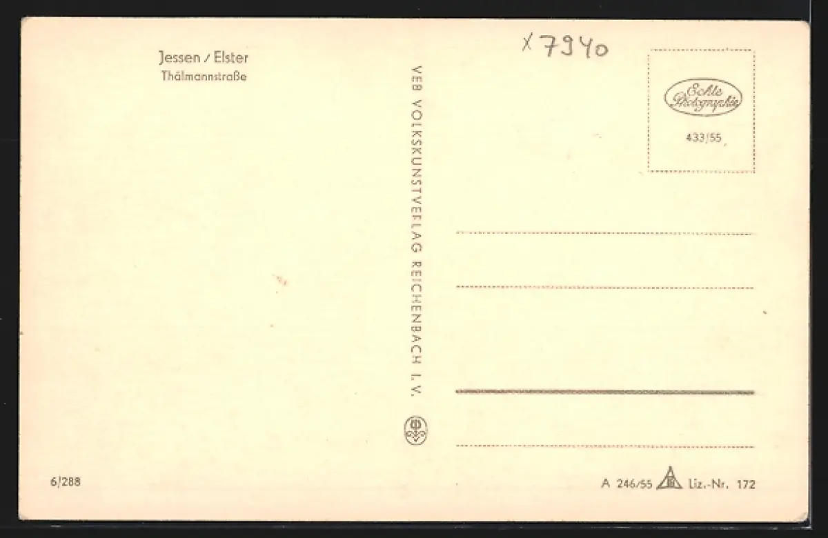 AK Jessen /Elster, Thälmannstrasse mit Bäckerei und Fleischerei Erich Tauscher