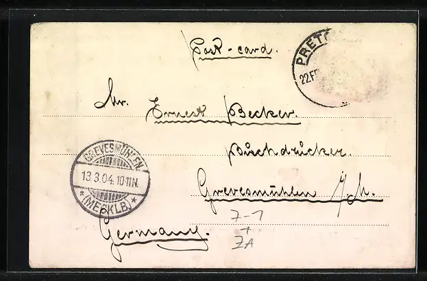 alte Ansichtskarte, gelaufen 1904, Briefmarke entfernt, rückseitig Oberflächenschaden, guter Zustand