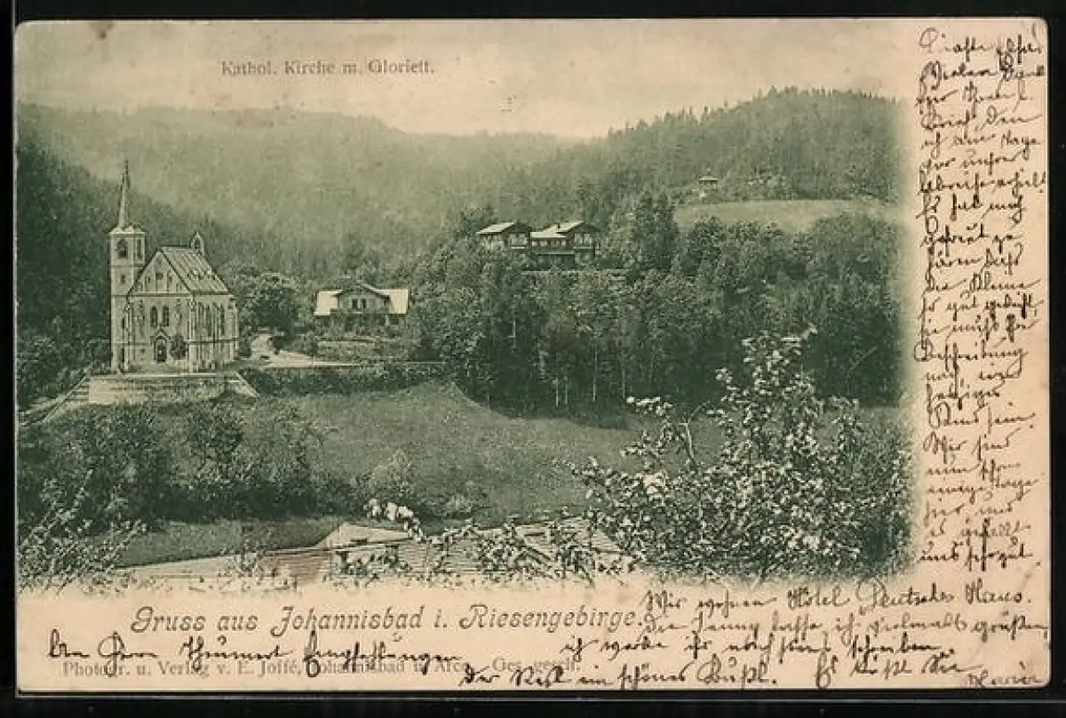 AK Johannisbad i. Riesengebirge, Kathol. Kirche m. Gloriett
