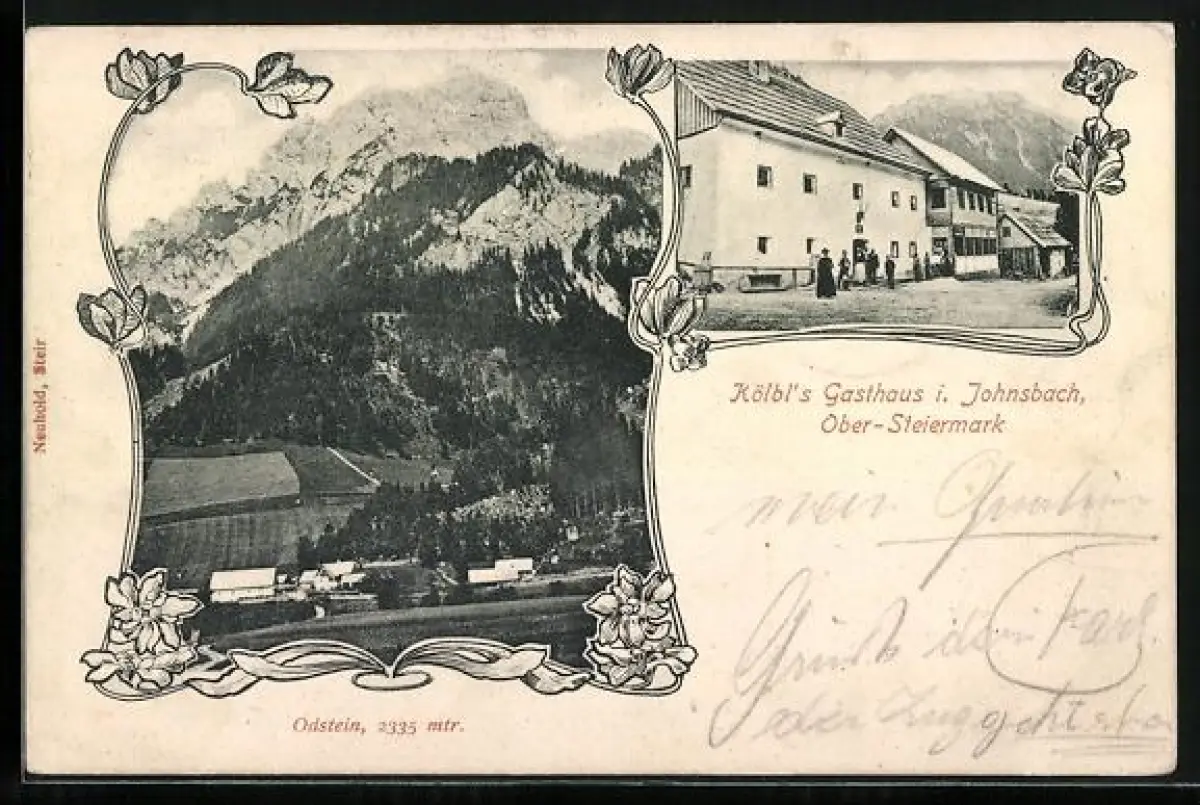 AK Johnsbach /Ober-Steiermark, Kölbls Gasthaus, Ortsansicht aus der Vogelschau