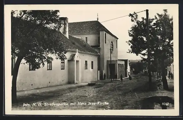 AK Jois /N. D., Strassenpartie mit Herz-Jesu-Kirche