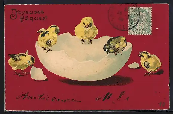 AK Joyeuses Pâques, Osterküken mit einer Eierschale