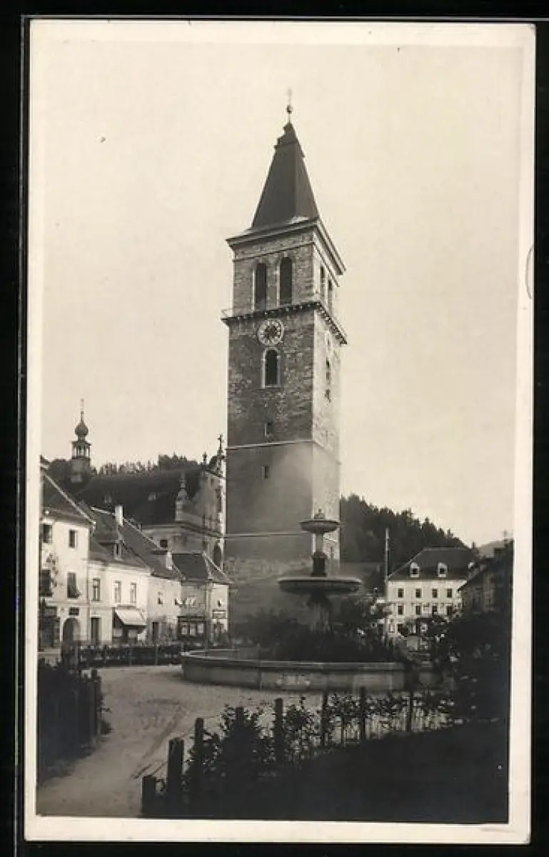 AK Judenburg, Stadtturm, davor eine Fontäne
