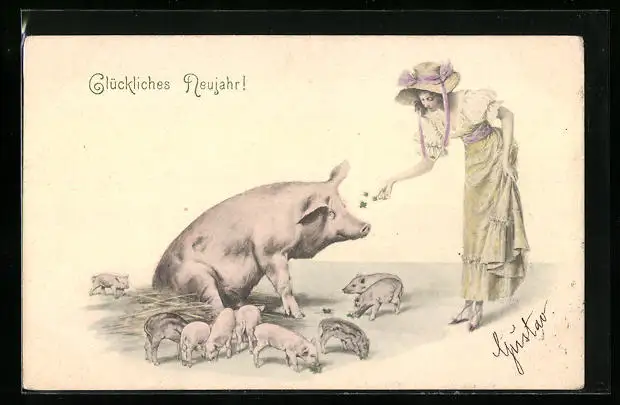 AK Junge Dame füttert Muttersau mit Glücksklee, Neujahrsgruss