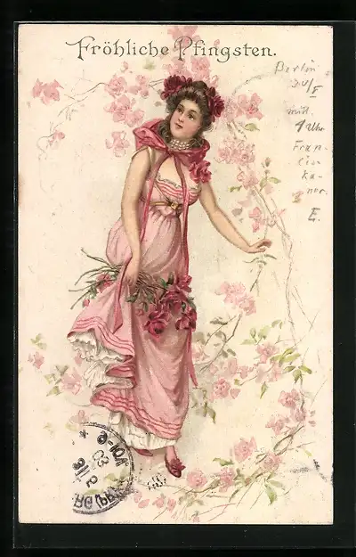 AK Junge Frau im Kleid mit Blumen, Pfingstgruss, Jugendstil